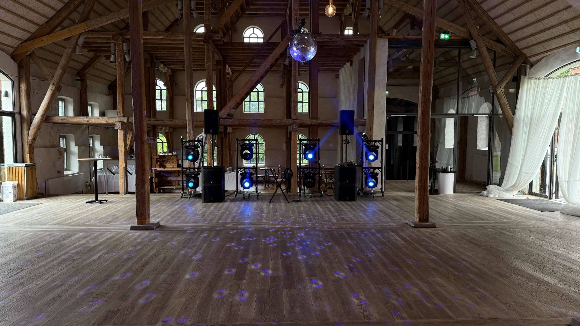 Nima Productions leverede en komplet produktion med professionelt lyd- og lyssetup, skræddersyet til rummets størrelse og akustik. For at sikre ensartet lyd i hele lokalet implementerede vi delay-højttalere, så alle gæster fik samme oplevelse – uanset placering. Derudover etablerede vi et stilrent DJ-setup samt en 75 cm spejlkugle, der skabte en eksklusiv og dynamisk lysoplevelse på dansegulvet. Gennem tæt dialog og rådgivning guidede vi kunden sikkert gennem alle valg – fra teknisk setup til den visuelle stemning.